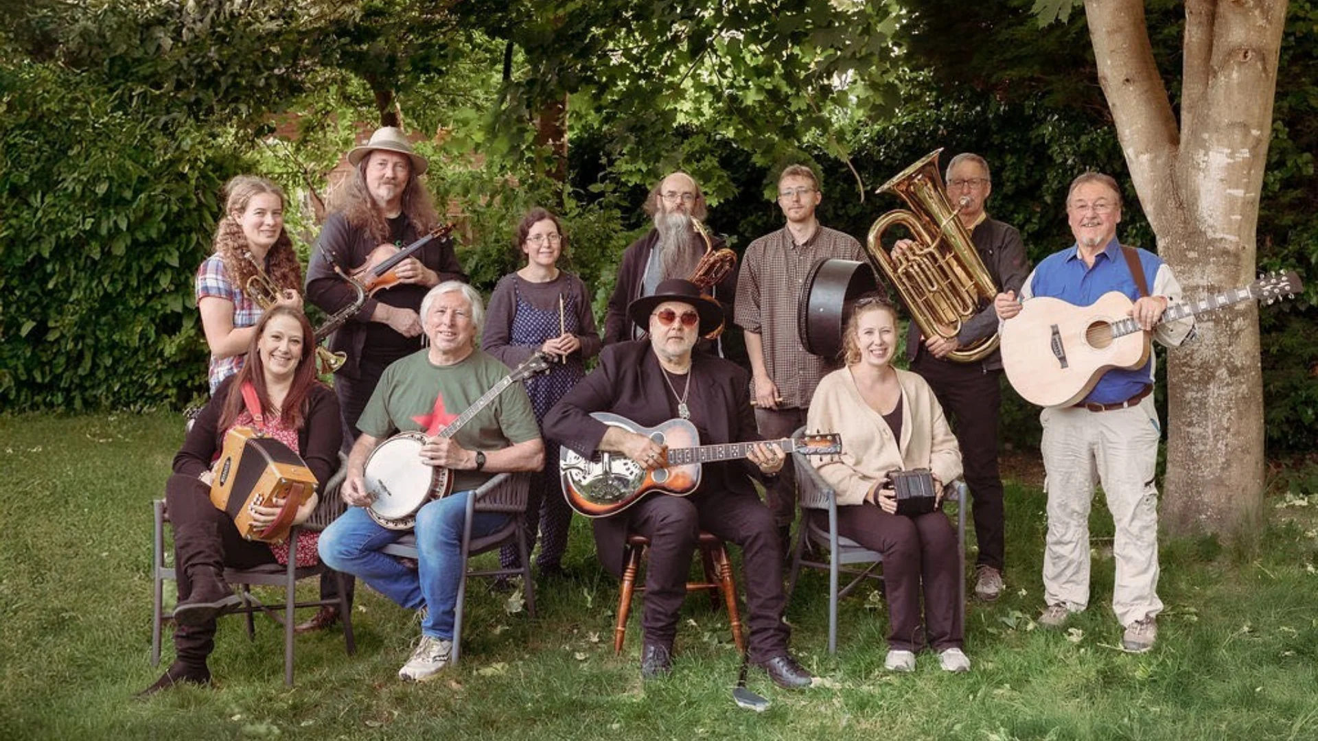 The sound of the band is what you might expect from the tune players: a mixture of rollicking traditional jigs and reels from the British Isles and America played on fiddle, concertina, accordion, banjo, piano and bodhrán, given even more punch with the addition of saxophones, trumpet, trombone and tuba with calling by Keith himself, of course.